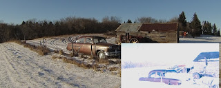 Two photos of the same car in the same location 44 years apart. The large one taken this past weekend. The small inset was in the winter of 1970-71. The old Mercury sat in retirement as Dad had been unable to start it no matter what he tried. Burnt valves, low compression and a weak six volt starting system were a bad combination. The exterior and interior were pretty nice but the engine was showing it's age. In the background sits the old shack, grandfather's homestead cabin built in 1903. Beside it the chassis of the 1946 Ford truck being gradually stripped down to the frame to eventually be converted into a very excellent single axle trailer.